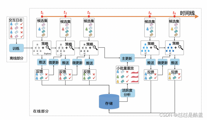 ① 深度强化学习网络DRN(Deep Reinforcement Learning Network),是微软在 2018 年提出的,它被应用在了新闻推荐的场景上。深度强化学习推荐系统框架图如下: