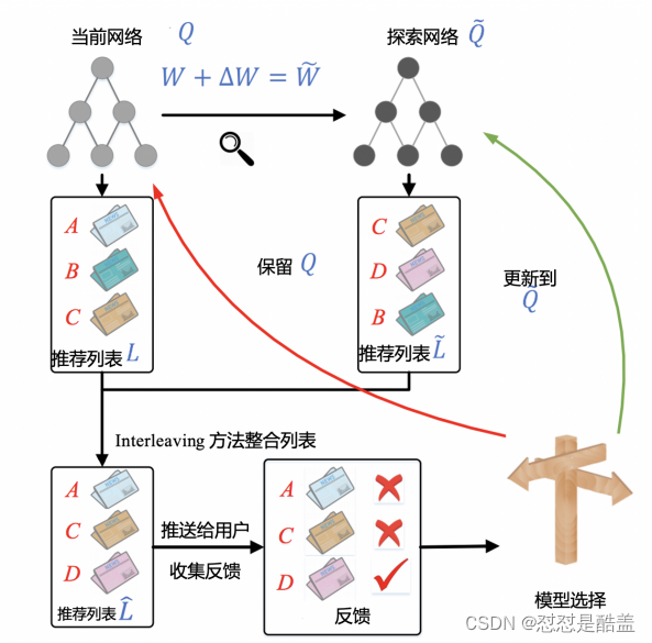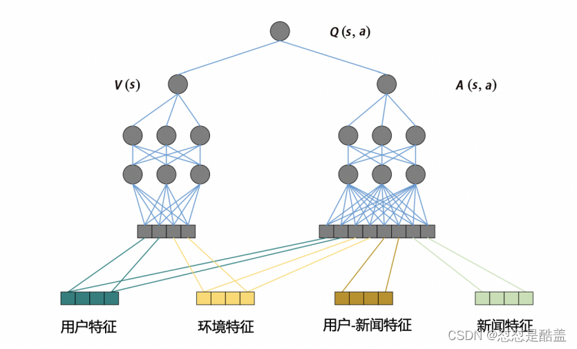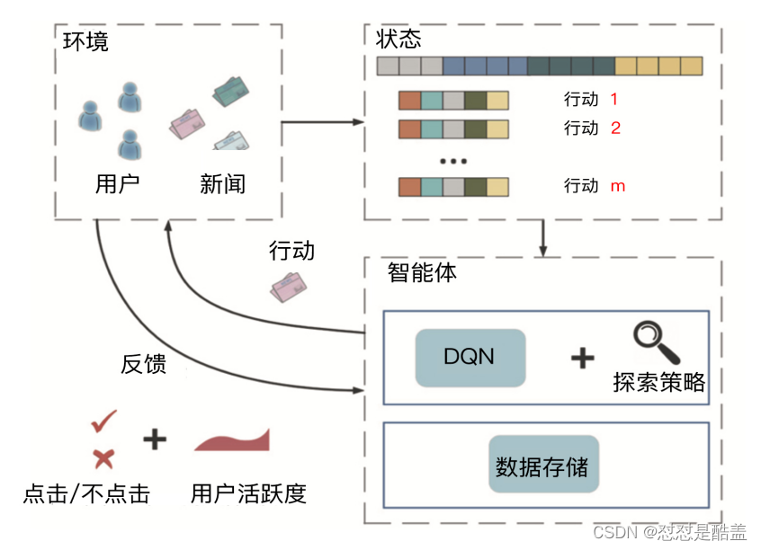 用户收到新闻推荐列表之后,可能会产生点击或者忽略推荐结果的反馈。这些反馈都会作为正向或者负向奖励再反馈给推荐系统。