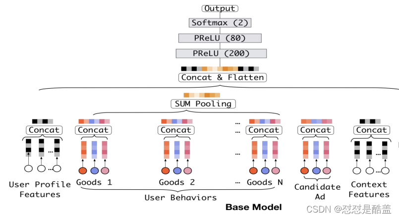 DIN的基础模型结构:是一个典型的 Embedding MLP 的结构。它的输入特征有用户属性特征(User Proflie Features)、用户行为特征(User Behaviors)、候选广告特征(Candidate Ad)和场景特征(Context Features)。