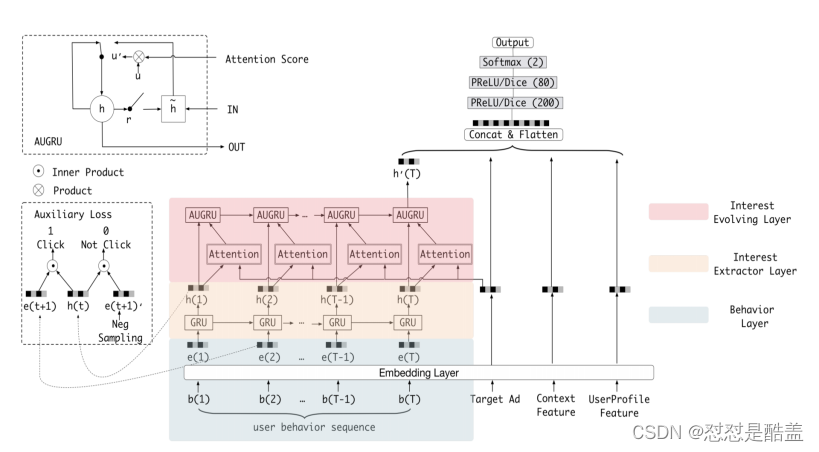 最上面一层是兴趣进化层(Interest Evolving Layer,浅红色部分)。它的主要作用是利用 AUGRU(GRU with Attention Update Gate) 组成的序列模型,在兴趣抽取层基础上加入注意力机制,模拟与当前目标广告(Target Ad)相关的兴趣进化过程,兴趣进化层的最后一个状态的输出就是用户当前的兴趣向量 h’(T)。