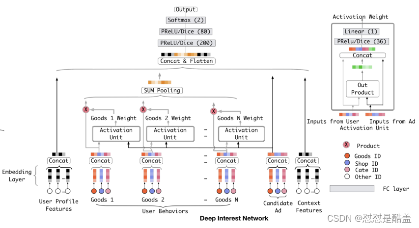 与 Base Model 相比,DIN 为每个用户的历史购买商品加上了一个激活单元(Activation Unit),这个激活单元生成了一个权重,这个权重就是用户对这个历史商品的注意力得分,权重的大小对应用户注意力的高低。
