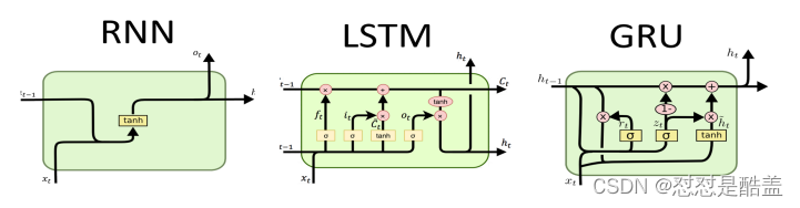 根据序列模型神经元结构的不同,最经典的有RNN、LSTM、GRU这 3 种,结构图如下: