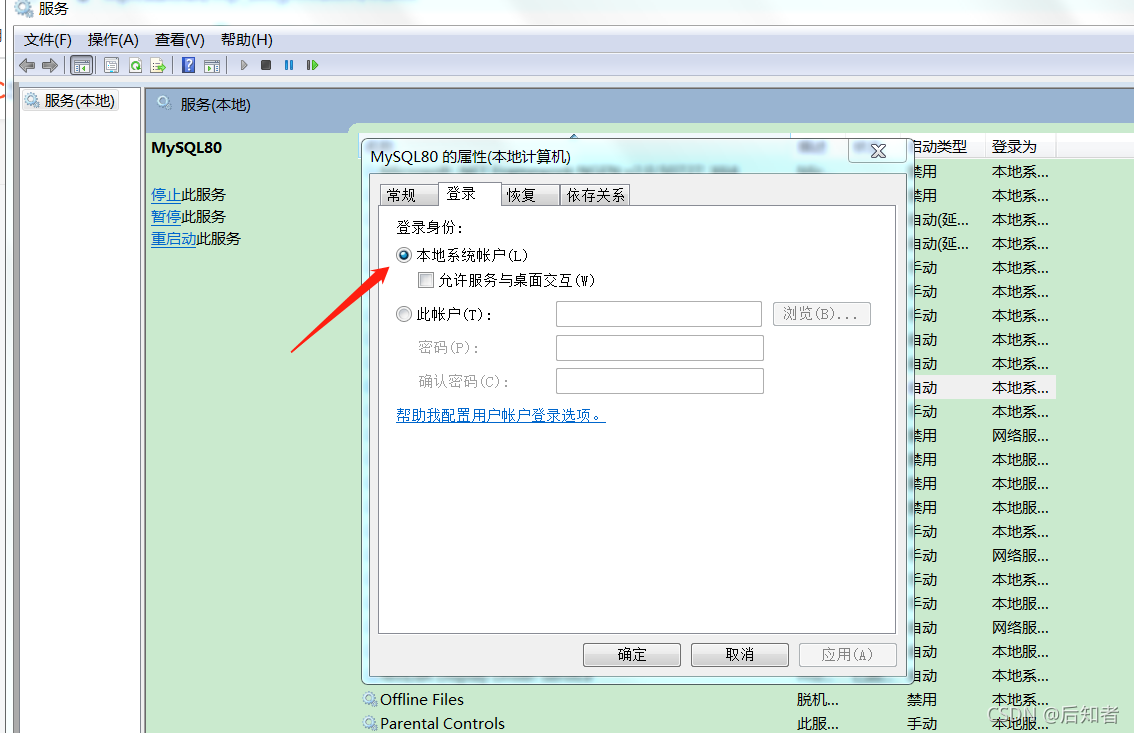 在运行中输入services.msc打开服务窗口,然后找到mysql服务,双击打开属性窗口,选择 “登录” 选项卡,然后登录身份 选择 “本地系统帐户” 然后应用,然后mysql安装过程就可以顺利往下执行啦。