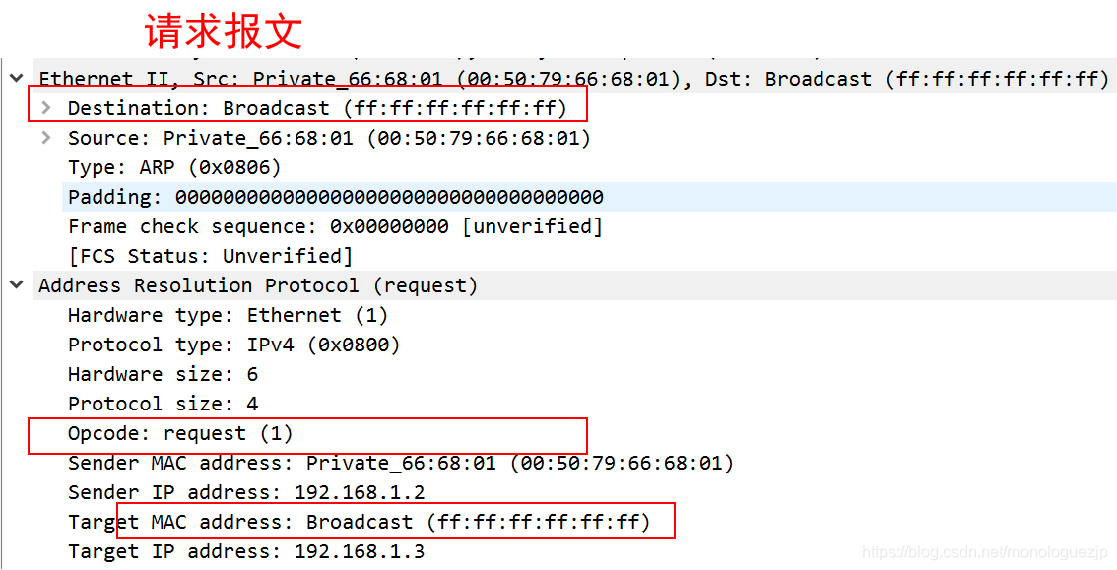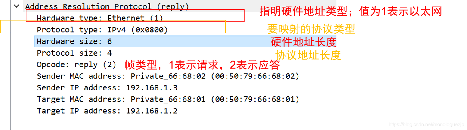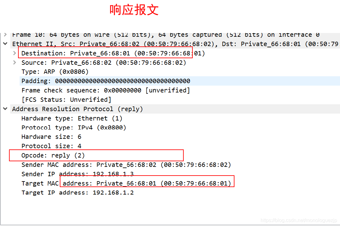 (3)PC2不响应这个请求,只有PC3收到该请求后,将PC1硬件地址存入ARP缓存表,并单播返回一个ARP响应帧,“ip 地址是192.168.1.3的Mac地址是 00:50:79:66:68:02”