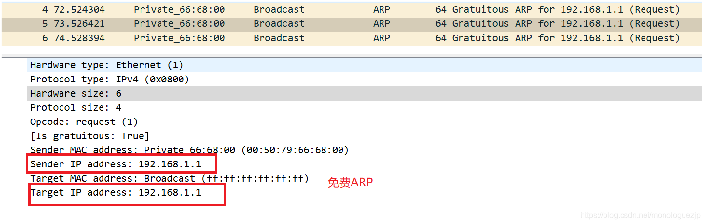 上图所示,通过抓包发现免费ARP的报文中,目的IP地址也是自己本身,这也是它与其他ARP包的区别之处。在网络中IP地址分配正常的情况下,我们可以看到,免费ARP请求报文是没有响应报文的。一旦免费ARP出现了响应报文,就说明当前主机配置的IP地址已经存在,与其他主机冲突了。