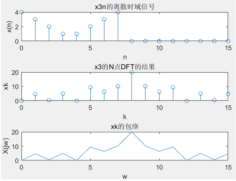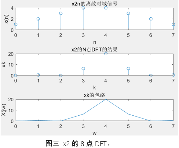 如图为X1n的8点DFT频谱分析,图中从上到下分别显示的是x1n的离散时域信号,8点DFT结果以及8点DFT的包络,补了4个0之后做的8点DFT。