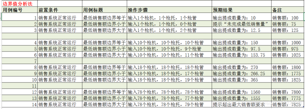 需求:销售公司销售系统,要求输入枪机、枪托、枪管的月销售量;输出:销售商的提成。销售公司,月供应量分别是:枪机70个,枪托80个,枪管90个;最低销售要求,售出一支完整的步枪;其中枪机、枪托和枪管的单价分别是:$45,$30,$25;月销售提成比例计算:[0,1000]提成比例10%;(1000,1800]提成比例:15%;(1800,+∞);提成比例20%。请根据需求根据边界值分析法和等价类划分法设计测试用例;
