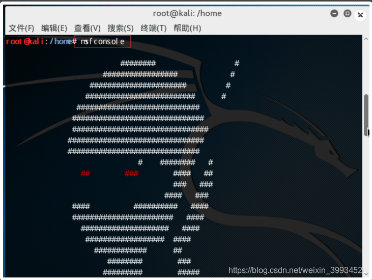 1.2 在终端中输入命令“msfconsole”,启动MSF终端。