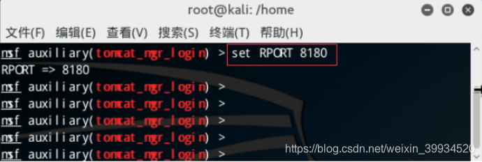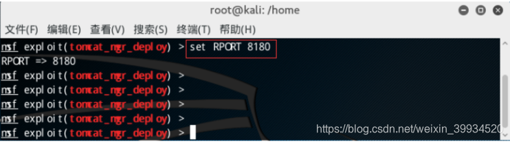 1.10 在终端下输入“set RPORT 8180”,设置攻击的目标主机端口号。