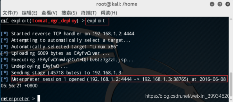 1.13 在终端下输入“exploit”,开始攻击,建立会话。(注:从下面的信息中我们看到 Linux x86说明服务器是Linux系统)