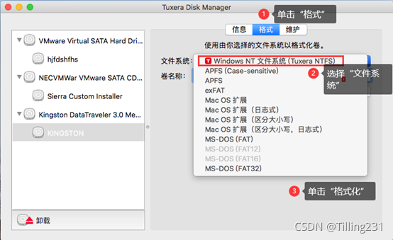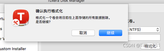 单击Tuxera Disk Manager界面中“格式”,于“文件系统”下拉菜单内选择系统格式,如“Tuxera NTFS”。然后,单击“格式化”。