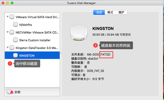 在Tuxera Disk Manager界面左侧,我们可以查看Mac上的硬盘,以及连接的移动磁盘,如“KINGSTON”。单击选中该磁盘,于右侧窗口便可查看该磁盘的基本信息,如内存大小、文件系统、磁盘名称、以及是否可移除等。