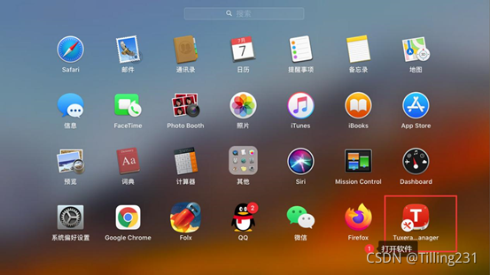 在Mac成功安装了Tuxera NTFS for Mac后,插入FAT 32格式的U盘。然后,打开Launchpad界面,找到已安装软件。