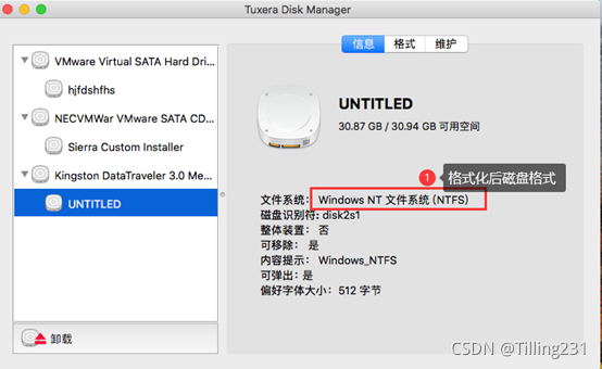 “格式化”后,稍等片刻,再次于Tuxera Disk Manager界面选中移动磁盘查看信息,文件系统已由图2步骤的FAT 32变为NTFS格式。