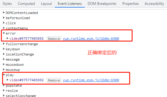 step2:加上其他可正常触发的方法,比如onplay,或者 addEventListener(‘error’),,发现onplay还有原本的error方法是可以看到在dom上绑定成功的;