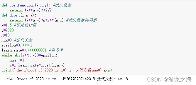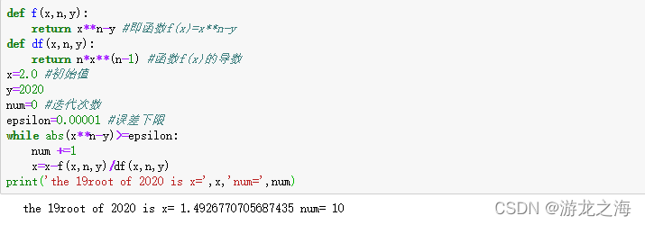 print('the 19root of 2020 is x=',x,'迭代次数num=',num)