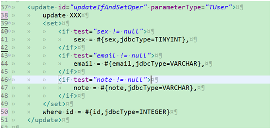 ②在 update 中使用 if 元素,set 元素可以在值 设置之前加 set 关键字,同时去掉语句最有 一个逗号