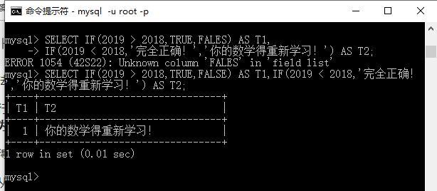 - IF(2019 > 2018,TRUE,FALES)执行报错,我们可以得知函数中可以指定的值为MySQL保留词;