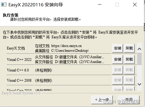 EasyX图形库指出Vs各种版本,下载解压后,直接执行安装程序即可。而其本质就是查找Vs的安装目录,并将相关文件分别拷贝至lib目录和include目录。