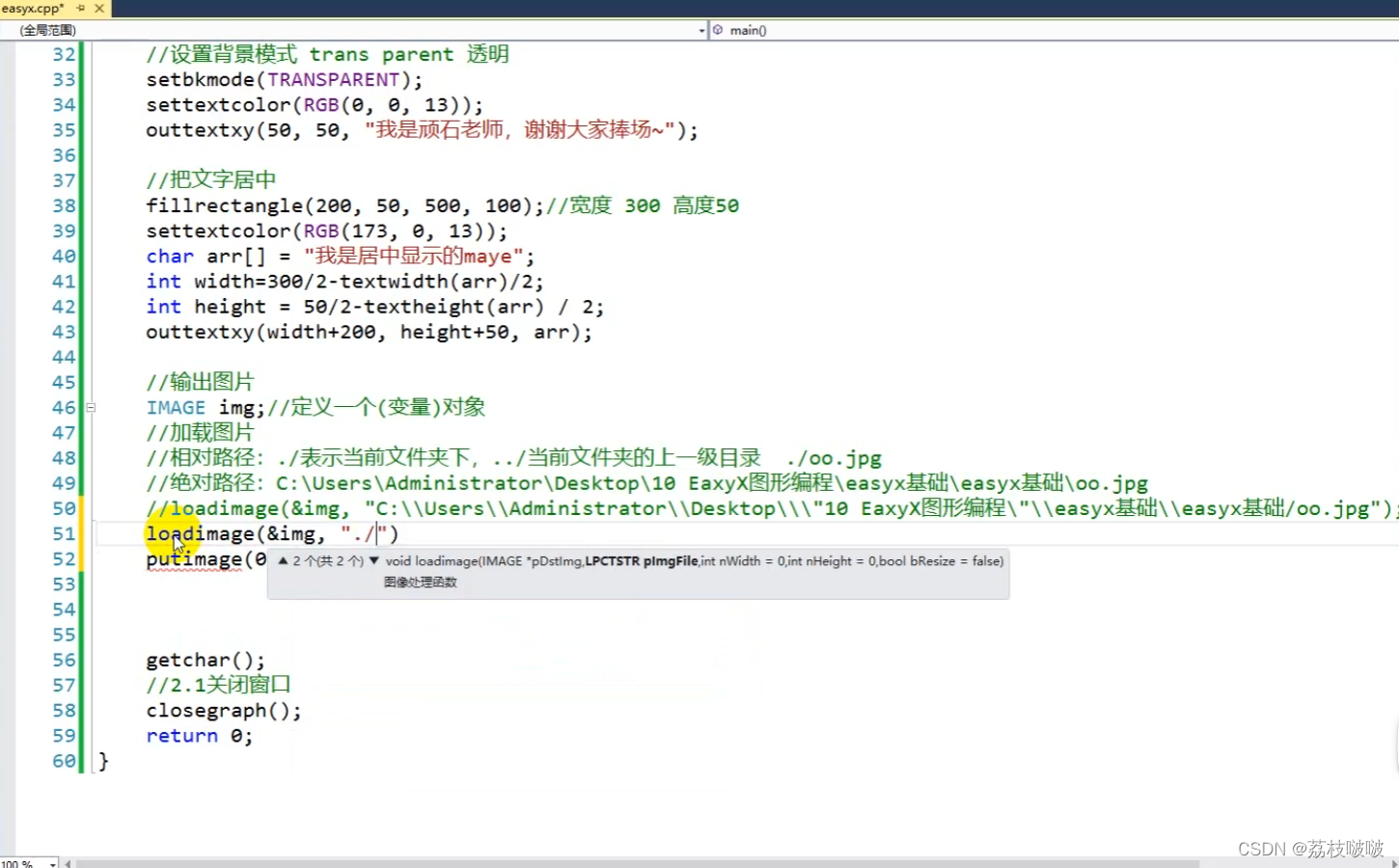 2.loadimage(IMAGE* pDstlmg,LPCTSTR plmgFile,int nWidth=0,int nHeight=0,bool bResize=false);从文件中读取图像