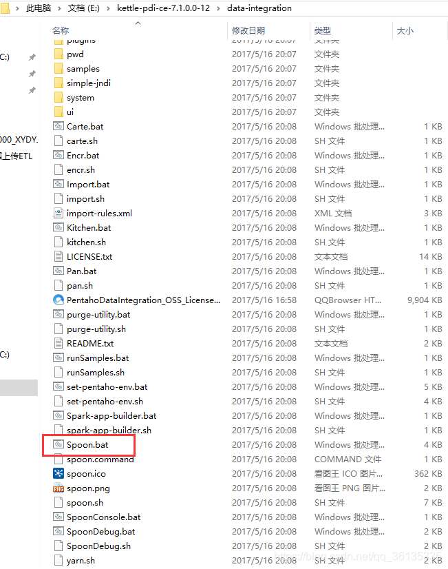 2、下载kettle压缩包,因kettle为绿色软件,解压缩到任意本地路径即可。然后打开Spoon.bat,如图所示: