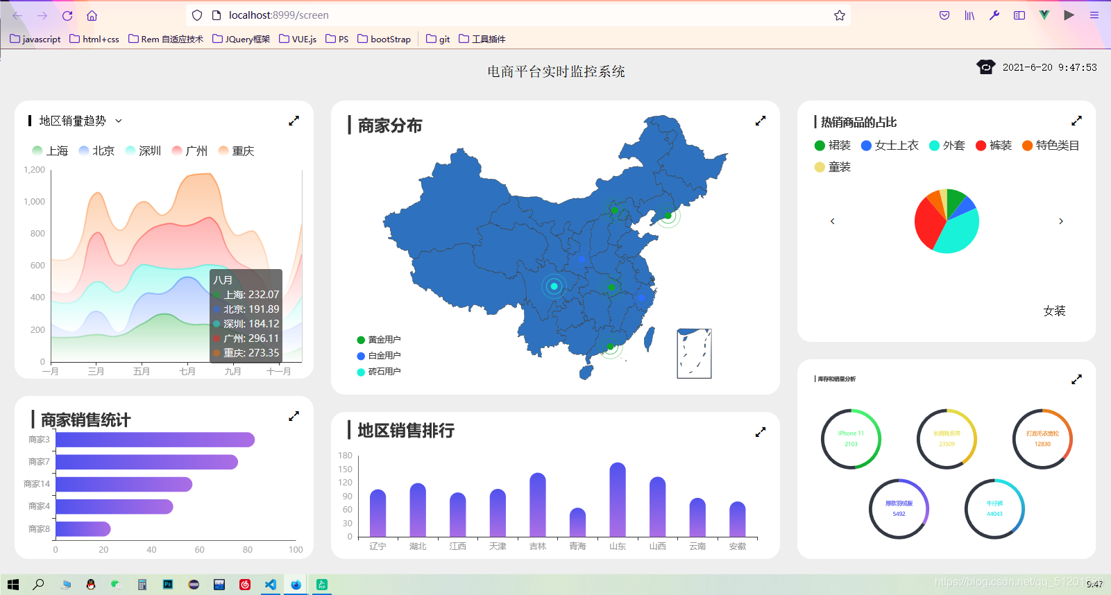 整个项目的架构是基于 Vue 的, 所以我们需要创建 Vue 项目, 然后在 Vue 项目中开发各个图表组件.涉及技术栈 :vue-cli、vue-router、vuex、node.js 、echarts、axios