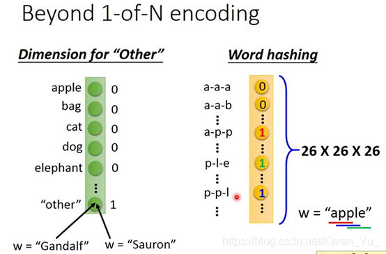有时候只是用1-of-N encoding来描述一个词的话,会遇到一些问题,因为有很多词汇可能从来都没有见过。所以会需要在1-of-N encoding里面加一个dimension——“other”。那么所有不是在我们词典里的词汇就会归类到“other”中