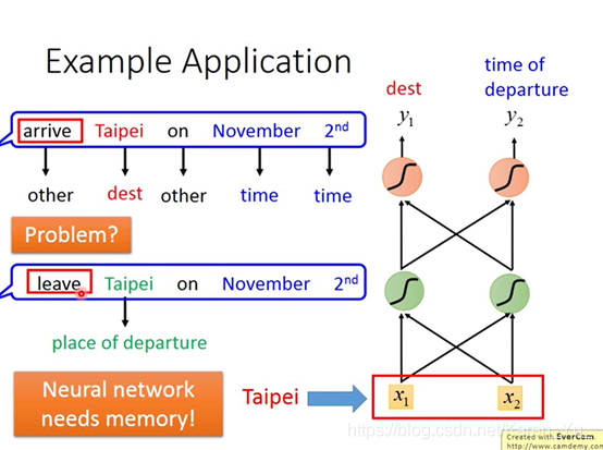 到达、离开的时候taipei代表的一个是目的地,一个是出发地。但是input一样的东西,那么output也是一样的,要不然就是出发地的概率最高,要不然就是目的地的概率最高,没办法让有时候出发地的概率高,有时候目的地的概率高。这个时候我们就希望neural network是有记忆的(这样它就记得它在看到红色的taipei之前就看到了arrive,在看到绿色的taipei之前就看到了leave),就可以根据一句话都上下文产生不同的output。