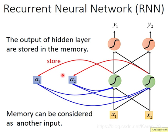 每一次hidden layer里的neuron产生output的时候,这个output都会被存到memory里面去。下一次当有input的时候,这些neuron不是只会考虑input的x1和x2,还会考虑存在memory里面的值