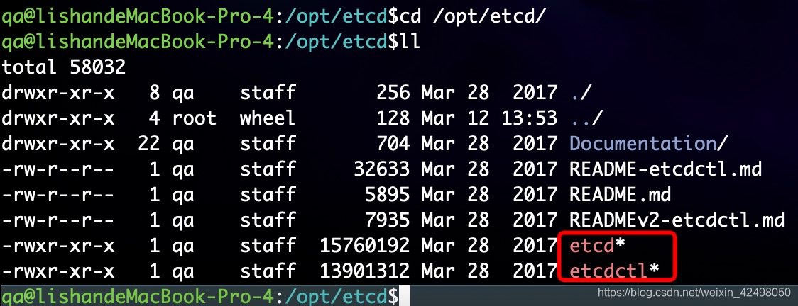 解压后是一些文档和两个二进制文件etcd和etcdctl。etcd是server端,etcdctl是客户端。