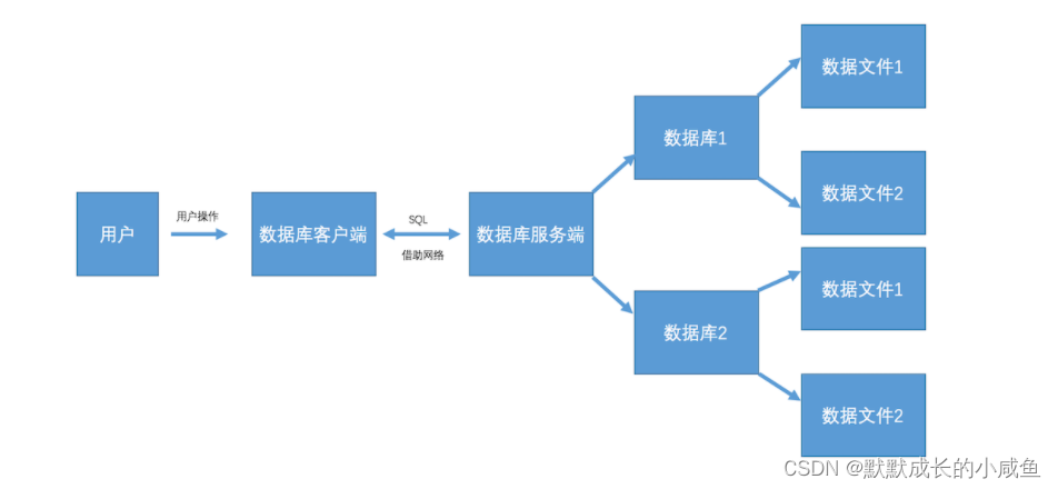 - 关系型数据库服务端管理着不同的数据库,每个数据库会有一系列的数据文件,数据都保存在数据文件里面,每个数据库可以理解成是一个文件夹。