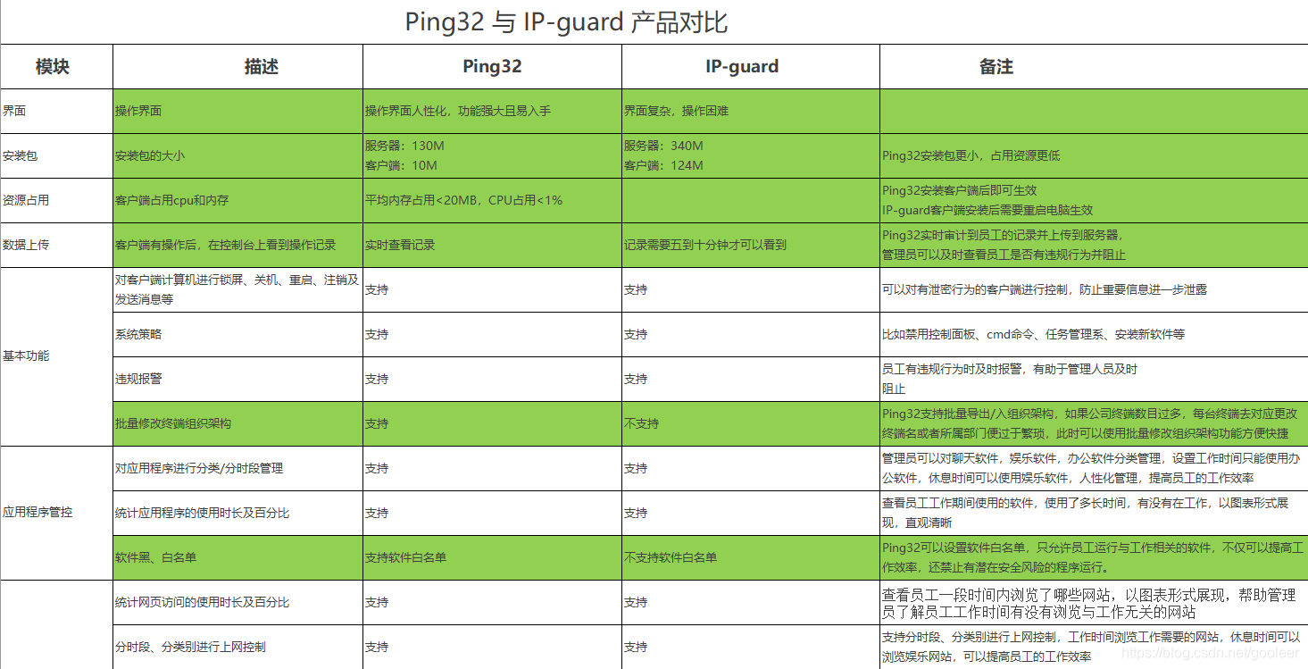 Ping32,推出了大概6、7年,核心功能也非常全 ,但是功能细致化成度不如IP-guard高。基本上我个人觉得500人以下的企业感觉不出来什么差别。但是优点就是操作简单、人性化。整体来说性价比要比IP-guard高。