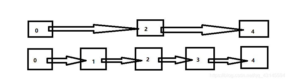 我们可以通过增加层数,提高搜索元素的效率。比如下图:当只存在单层链表时,如果我们要搜索元素4,我们必须对链表进行一层遍历至链表末尾才可以找到元素。当我们增加层数时(我们假设第一层与第二层的节点个数比值为1:2),我们只需要遍历一半的链表节点数,便可以找到该元素,如果继续增加层数时,我们遍历的链表节点数会更少。此时,通过对链表进行加层而构成的的数据结构,我们称为跳跃表。
