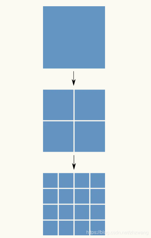 假设有一张4×4的地图,我们降低其分辨率,每2×2的格子合并成一个,得到一张2×2的地图,再降低其分辨率,得到一张1×1的地图。这样,地图被分成了三层,如下图所示。
