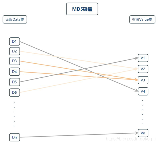 其实不仅是MD5,任何一个hash函数,都有被碰撞的可能,所谓碰撞,就是输入不同的值Value和Value得到相同的hash值,这其实不难证明,MD5生成的hash值是由128位组成的,而它必然是一个有限集合,而我们的输入数据是一个无限集,一个无限集映射到有限集上,必然存在两个或多个无限集中的元素映射到同一有限集元素的情况。