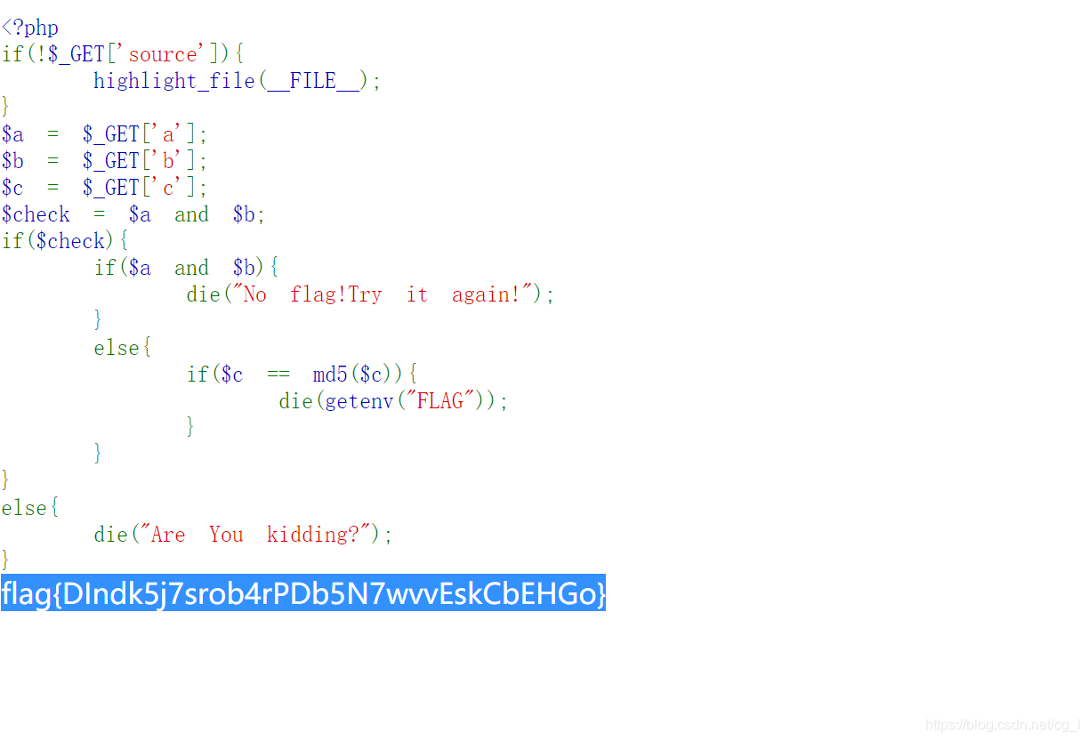 本职工作极少接触CTF相关知识,初看此题直接是懵的。代码清晰而简单这里不表,唯一让我困惑的是if($c == md5($c))这一条语句,分析可知当$c==md5($c) 即可拿到Flag。