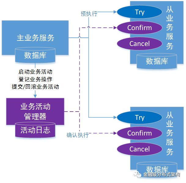 从业务服务:从业务服务是整个业务活动的参与方,负责提供 TCC 业务操作,实现初步操作(Try)、确认操作(Confirm)、取消操作(Cancel)三个接口,供主业务服务调用。