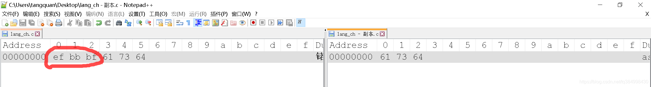可以看到,UTF-8带BOM编码的文件前面多了0xEF 0xBB 0xBF这三个字节。