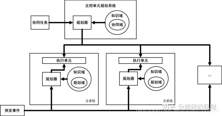所示,按照分层式结构建立两种工作模式:事先的离线规划由主控单元负责,首先获得协同任务,经过规划器得到具体的行为运动规划,并分发给各分系统执行单元,相关的知识域中主要是用于描述各分系统协商规则的协商域,主控单元从外界获取环境信息,从各分系统获取状态信息;当遇到突发事件或紧急任务变更以及主控单元停止工作时,各分系统采用分布式结构,单独规划各自运动行为,并从各自的知识域中获取协商方式,外界环境信息由主控单元发送和自我感知相结合获得(主控单元停止工作时,仅靠自我感知获取信息),其它机器人信息的传输由机器人间的数据链实现。