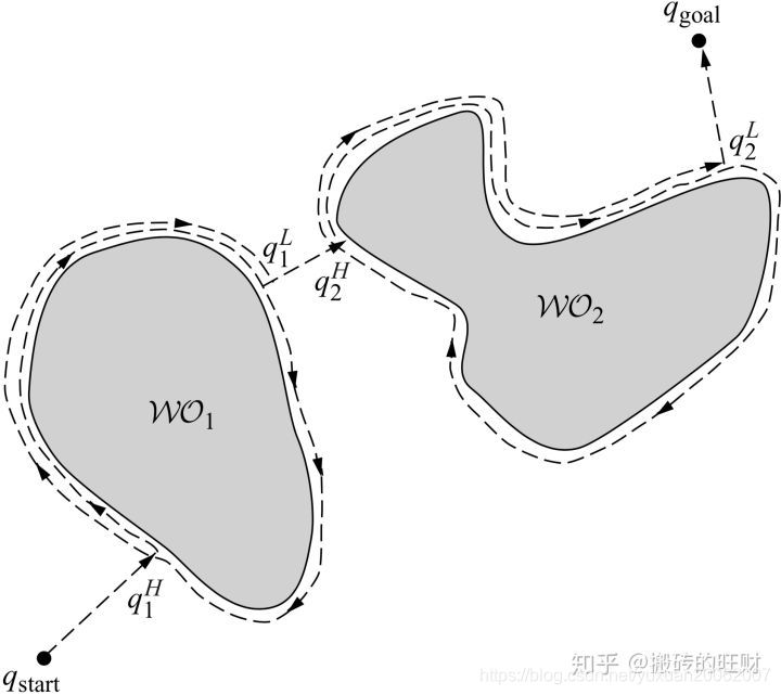是连接初始点和目标点的直线,在计算过程中保持不变。当机器人在点遇到障碍物时,机器人开始绕行障碍物,如果机器人在绕行过程中在距离目标更近的点再次遇到直线