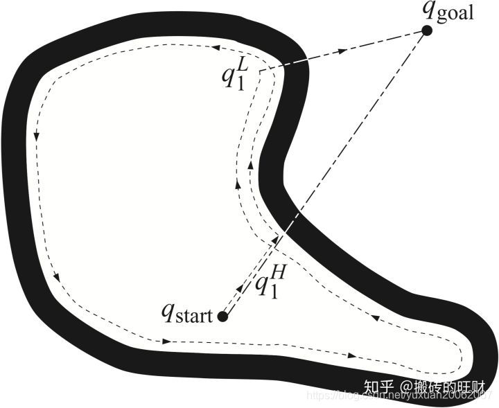 点是机器人探索距离在障碍物边界上的局部极小点。机器人开始沿着障碍物边界进行环绕,图中虚线路径就是机器人环绕障碍物时所走的路径。当机器人探测到与目标距离相比