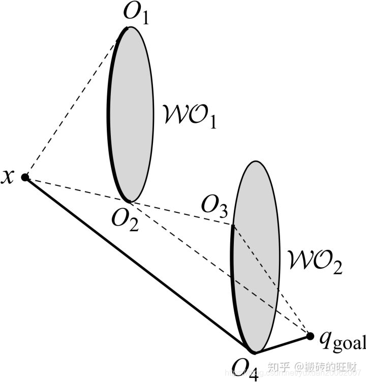 不同障碍物之间顶点可见性的判断则转化为判断顶点连线是否会与其它顶点连线相交的几何问题。如下图虚线所示,