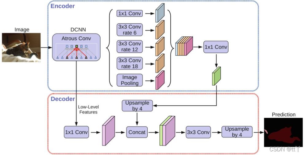 我们看网络结构图中Decorder中的“Upsample by 4”和“Concat”可以推出backbone的两个输出:一个是低级特征(low-level feature),这是个output=4x的输出;另一个是高级特征,给ASPP的输入,这是个output=16x的输出