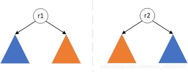 题解的思路为:递归的子问题为判断两棵子树是否是对称的。初始条件如图1所示,根节点肯定是对称的,需要左子树和右子树是否对称。将图一中的左右子树继续拆分,如图2所示,首先判断两棵子树的根节点r1和r2是否相同,再判断根r1的左子树是否和根r2的右子树对称,且根r1的右子树是否和r2的左子树对称。即递归子问题为判断两棵子树是否是对称。