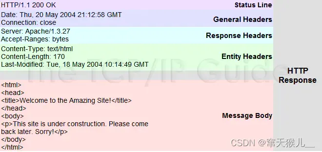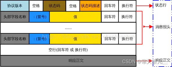 从服务器端到客户器端的响应信息,信息由4部分组成:状态行、消息报头、空行、响应正文。