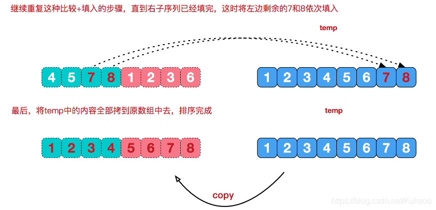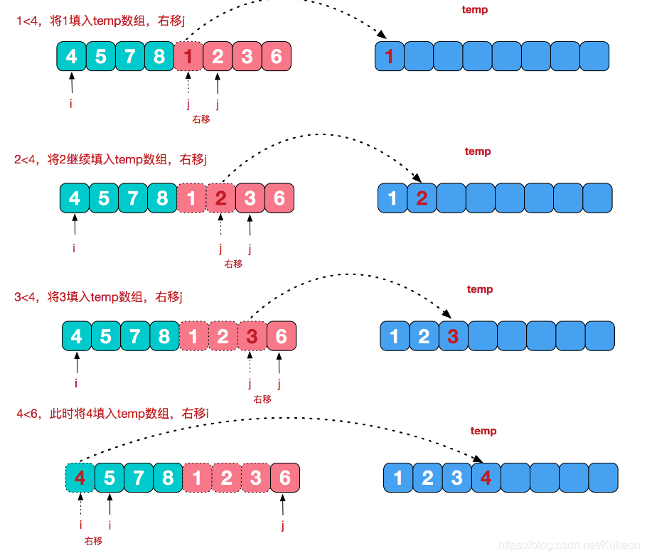 //则先添加左子序列至临时数组,然后左子序列下标往后移一位