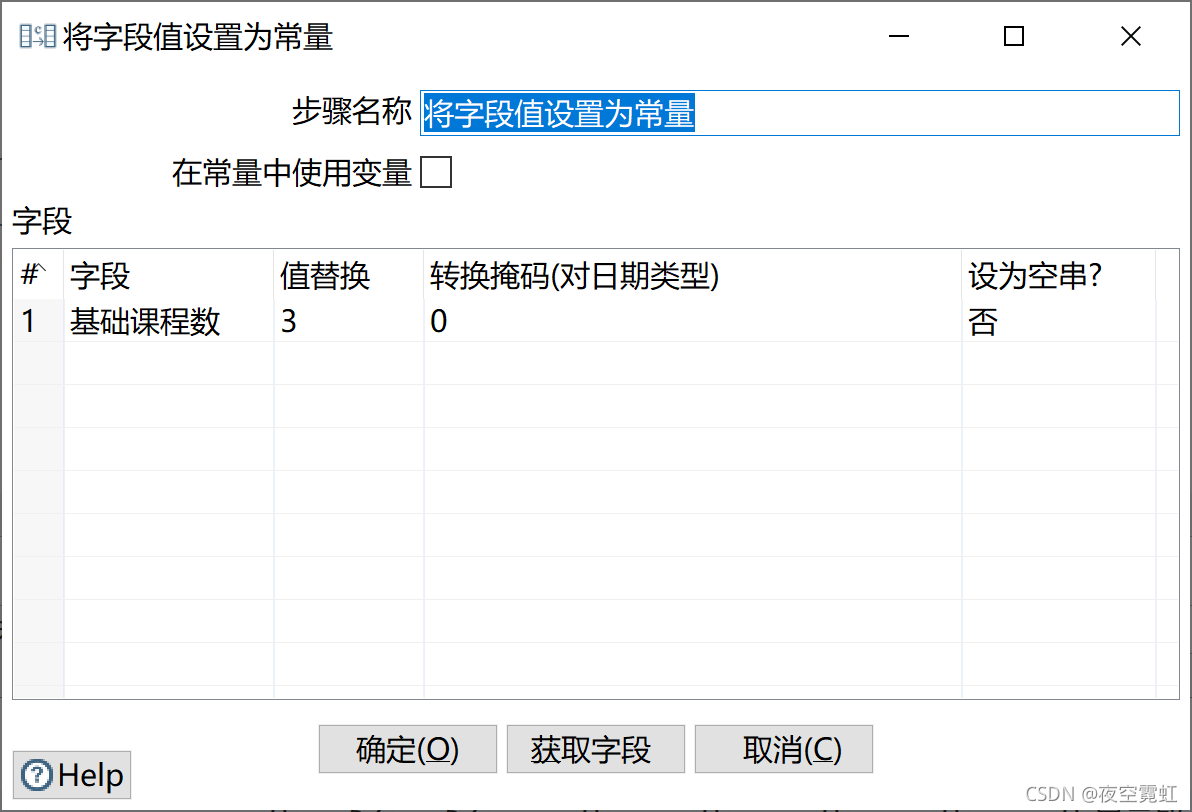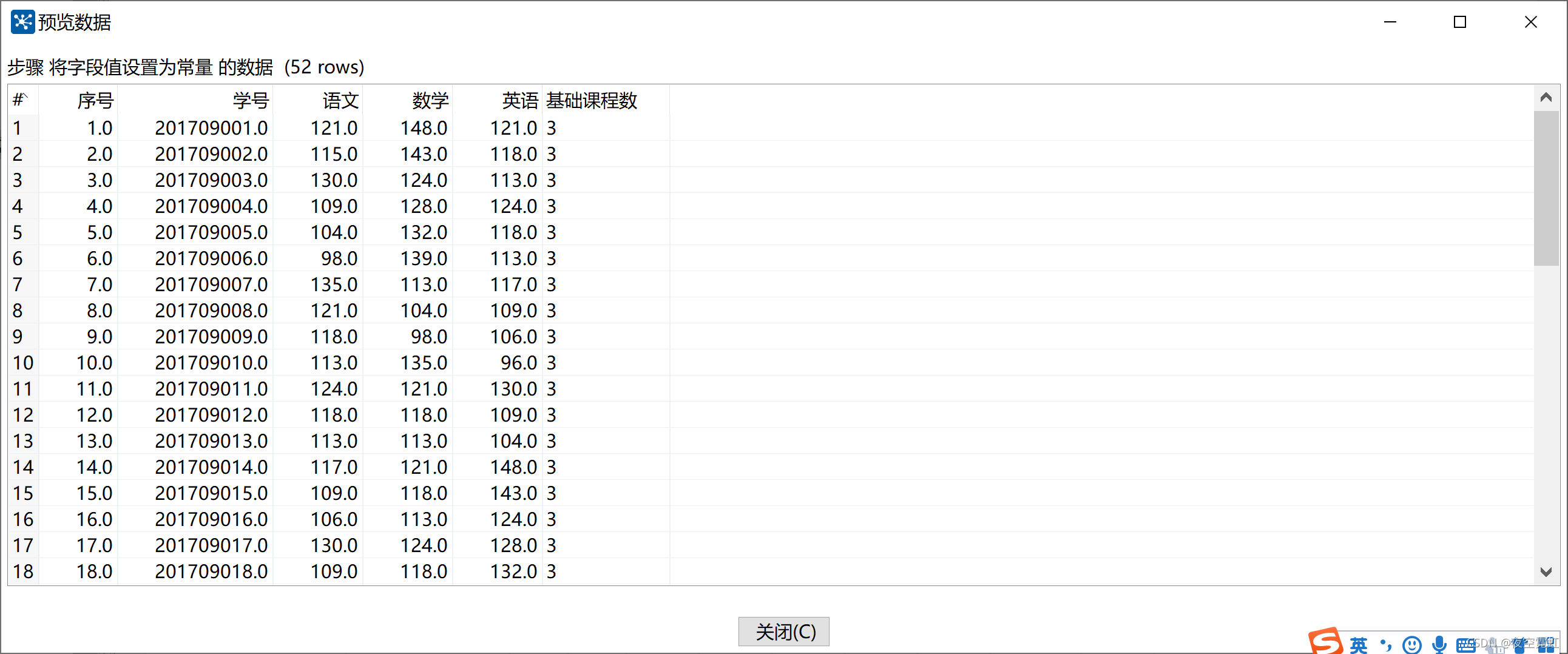 增加常量是增加字段,并给该字段赋值。与增加常量类似,将字段值设置为常量,是对现有的字段重新赋一个新的固定值。为了统计课程考试的平均分数,需要在“2018年上学期期末语数英考试成绩.xls”文件中,对其中数据为空的“基础课程数”字段,采用字段值设置为常量组件,设置“基础课程数”字段的数据为“3”,表示语文、数学和英语等3门基础课程数。