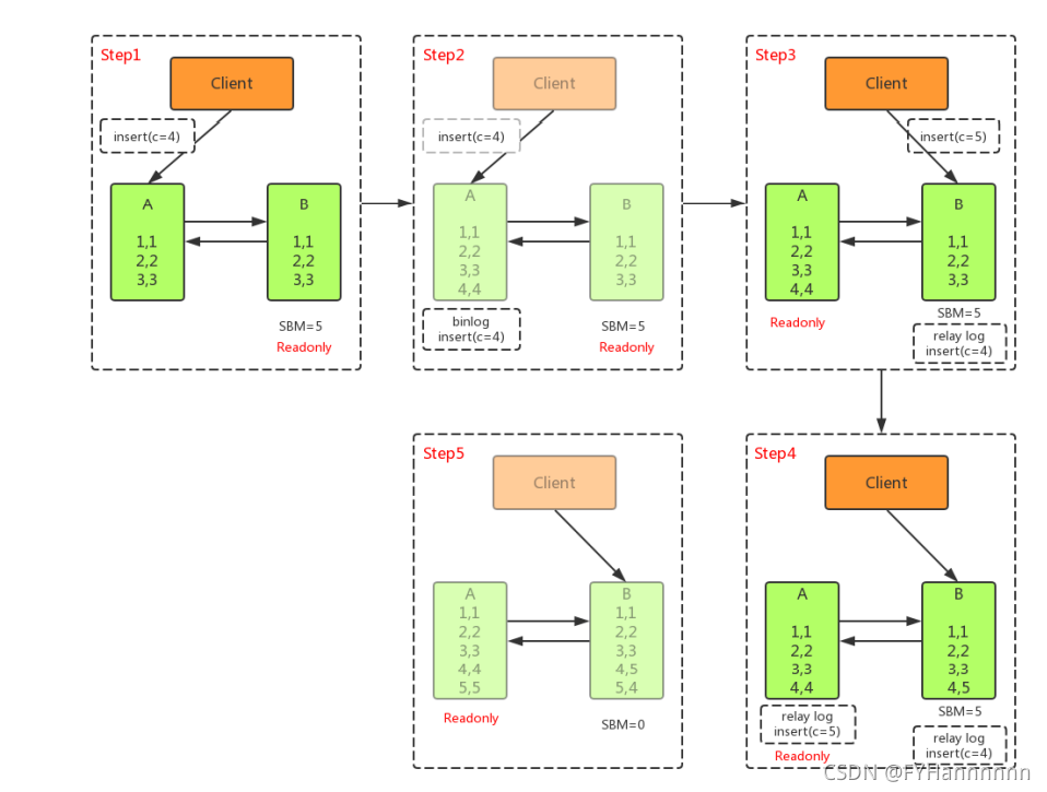 - 主库A执行从库B传过来的binlog日志 INSERT c=5 ,得到 (5,5)