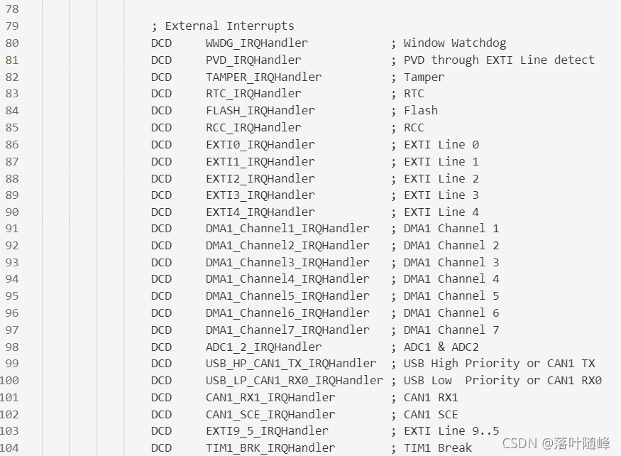 :对于RCT6来说,它的中断源如上图所示,在stm32f103.h中已经配置好寄存器,直接调用即可,下图中,RCT6主要用的是STM32F103X_HD的中断源