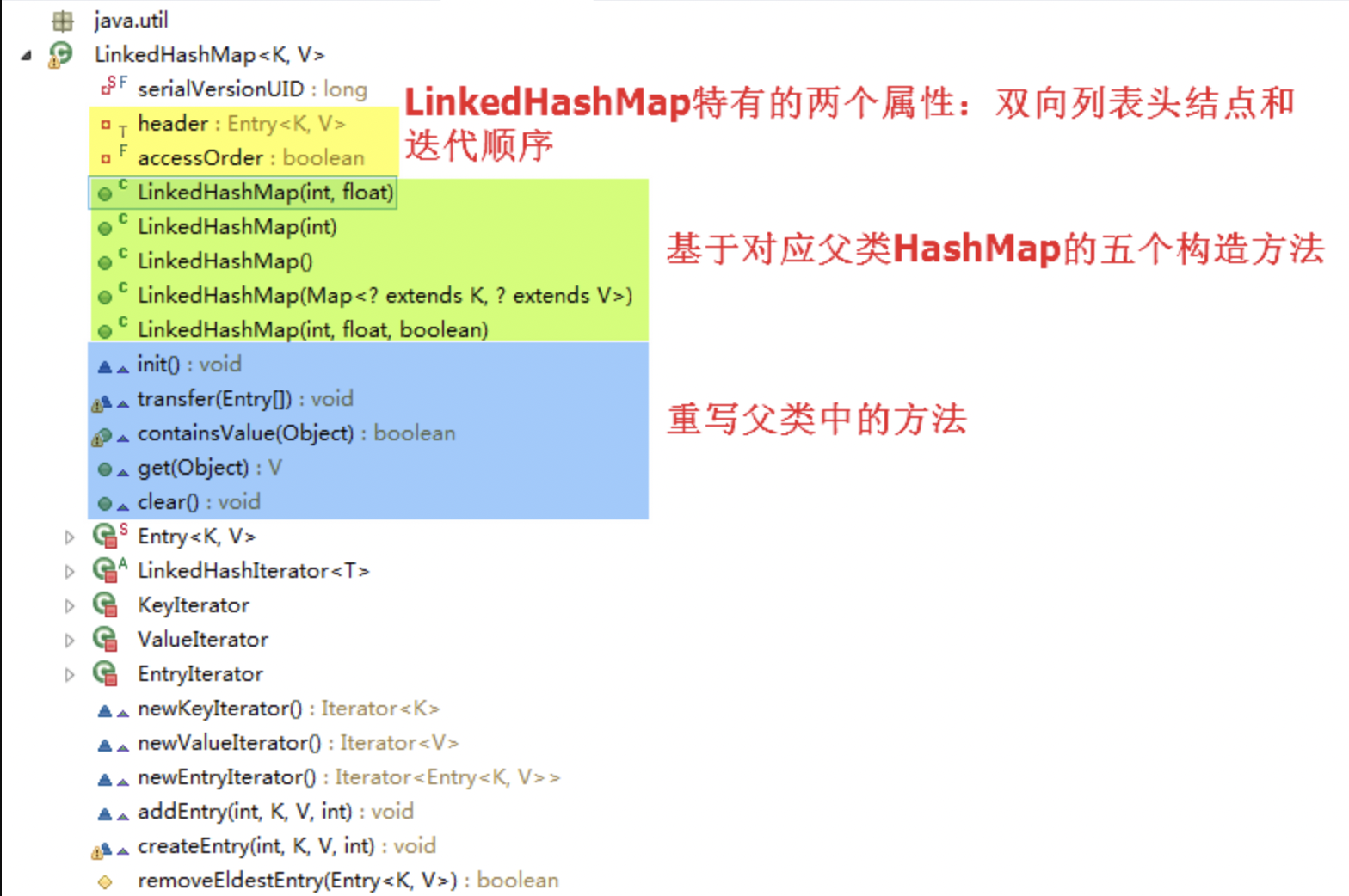 与HashMap相比,LinkedHashMap增加了两个属性用于保证迭代顺序,分别是 双向链表头结点header 和 标志位accessOrder (值为true时,表示按照访问顺序迭代;值为false时,表示按照插入顺序迭代)。
